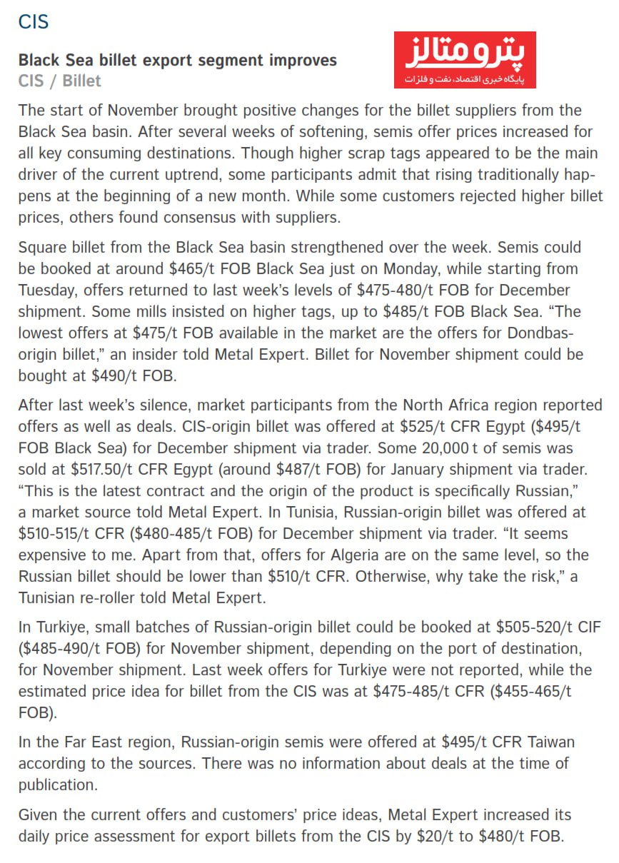 کف قیمت پیشنهادی صادرکنندگان شمش از حوزه دریای سیاه به ۴۷۵ دلار به ازای هر تن رسیده که مربوط به صادرکنندگان تحت تحریم منطقه جداییطلب دنباس است. برخی فروشندگان حتی قیمت پیشنهادی خود را تا ۴۸۵ دلار هم بالا بردهاند و شمش برای تحویل در ماه نوامبر با قیمت فوب ۴۹۰ دلار به ازای هر تن پیشنهاد میشود.