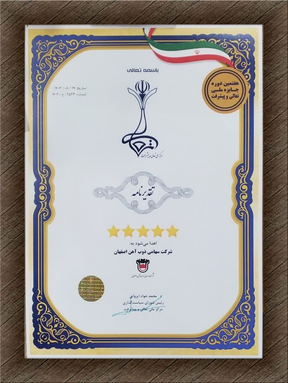 ذوب آهن اصفهان موفق به دریافت تقدیرنامه 5 ستاره جایزه ملی تعالی و پیشرفت شد
