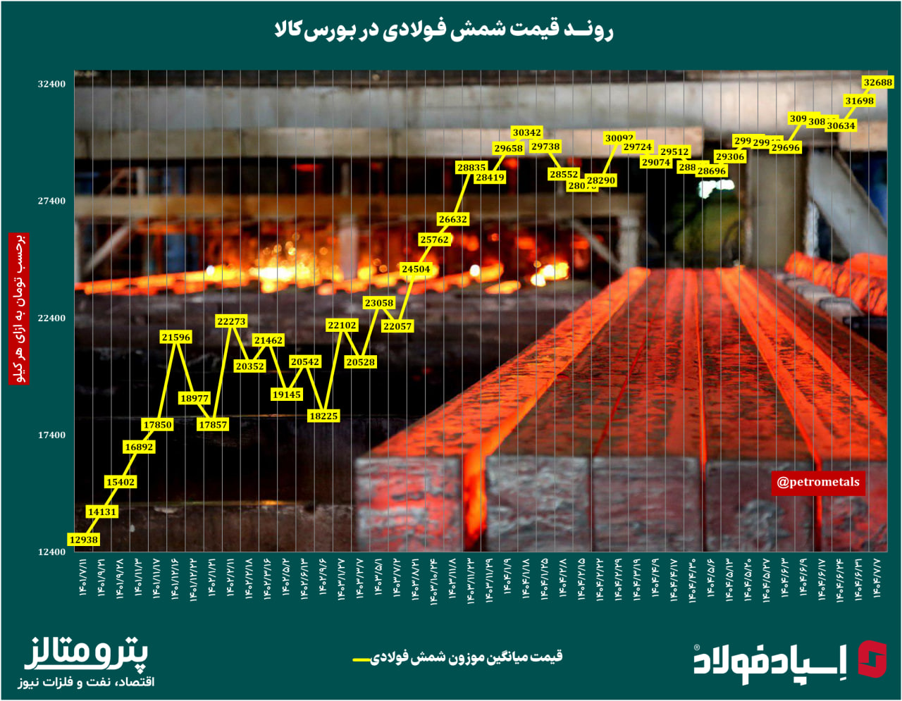 به گزارش اقتصاد، نفت و فلزات نیوز، در هفته جاری قیمت شمش فولادی در بورس کالا نسبت به هفته گذشته ۹۹۰ تومان به ازای هر کیلو معادل ۳.۱ درصد افزایش یافت و به ۳۲۶۸۸ تومان به ازای هر کیلو بدون احتساب مالیات بر ارزش افزوده رسید که بالاترین قیمت شمش فولادی در تاریخ معاملات آن در بورس کالا است. در هفته جاری، قیمت شمش فولادی برای دومین هفته پیاپی رکوردشکنی کرد.