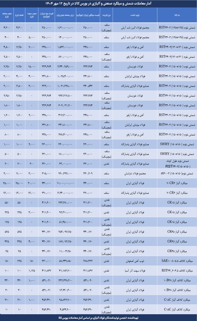 در این میان، شرکت‌های پیشرو از نظر مجموع حجم معاملات شمش و میلگرد صنعتی و آلیاژی به شرح زیر بود: فولاد آلیاژی ایران با ۲۷,۶۰۵ تن در صدر ایستاد و تمرکز اصلی خود را بر میلگردهای آلیاژی گذاشت؛ صنایع فولاد آلیاژی پاسارگاد با ۲۰,۷۰۰ تن در رتبه دوم قرار گرفت و ترکیبی از شمش و میلگرد آلیاژی عرضه کرد؛ فولاد خوزستان با ۱۲,۰۰۰ تن عمدتاً در شمش بلوم پیشتازی کرد؛و آهن و فولاد ارفع با ۹,۰۰۰ تن در حوزه شمش بلوم فعال بود.