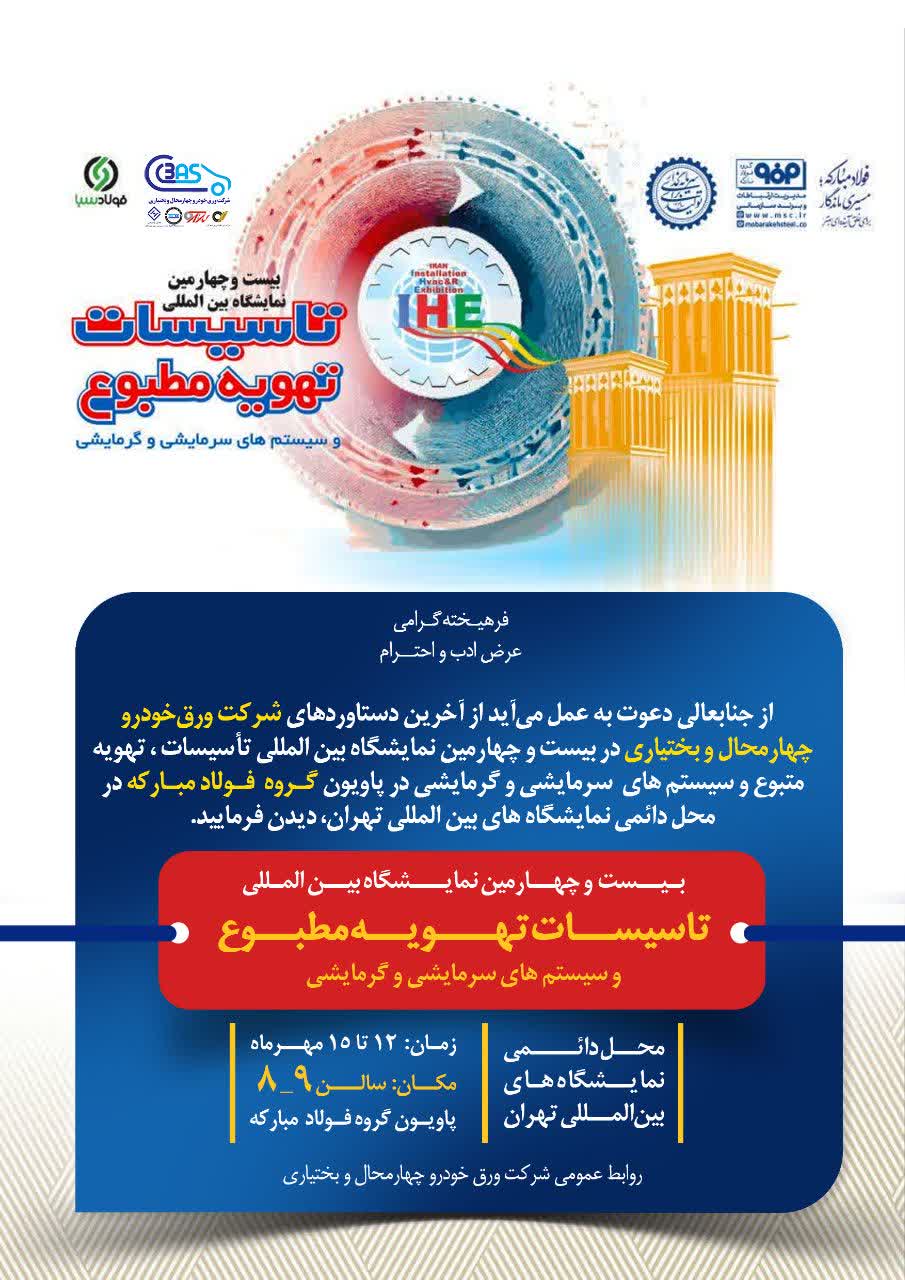 گروه فولاد مبارکه با حضور شرکت‌های ورق‌ خودرو چهارمحال و بختیاری و نورد و فولاد سبا، در قالب پاویون اختصاصی در سالن ۹-۸ این نمایشگاه حضوری پررنگ خواهد داشت و توانمندی‌ها و دستاوردهای خود را به نمایش خواهد گذاشت. در همین چارچوب، شرکت ورق‌خودرو چهارمحال و بختیاری به‌عنوان تولیدکننده بیش از نیمی از محصولات ورق گالوانیزه کشور، بخشی از این پاویون را به معرفی محصولات و توانایی‌های خود اختصاص داده و میزبان فعالان صنعت تأسیسات، تهویه و سیستم‌های سرمایشی و گرمایشی کشور خواهد بود.