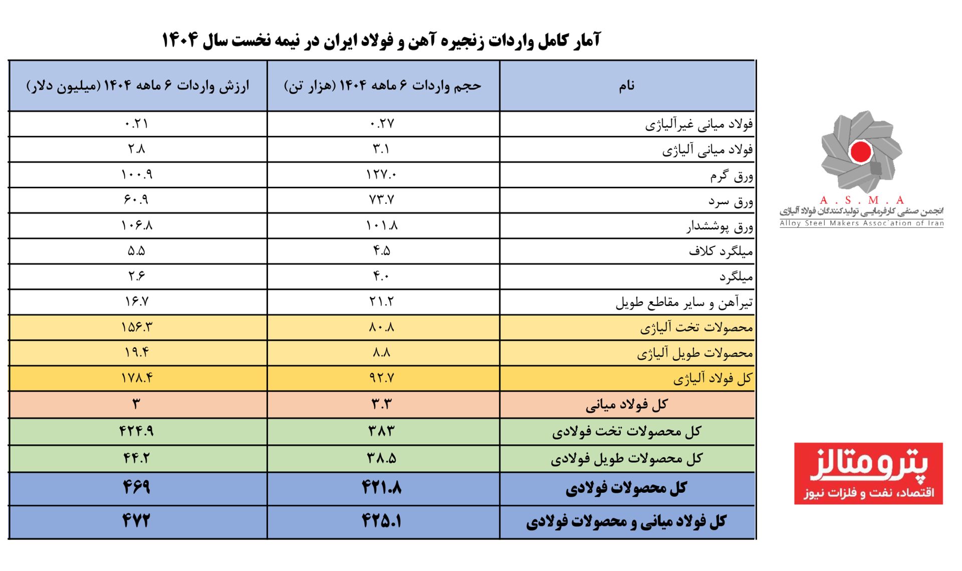 در مجموع، واردات فولاد آلیاژی (شامل فولاد میانی و محصولات نهایی آلیاژی) در نیمه نخست سال ۱۴۰۴ معادل ۹۲.۷ هزار تن و ارزشی برابر ۱۷۸.۴ میلیون دلار گزارش شده است که سهم قابل توجهی از ارزش کل واردات فولادی کشور را تشکیل می‌دهد.