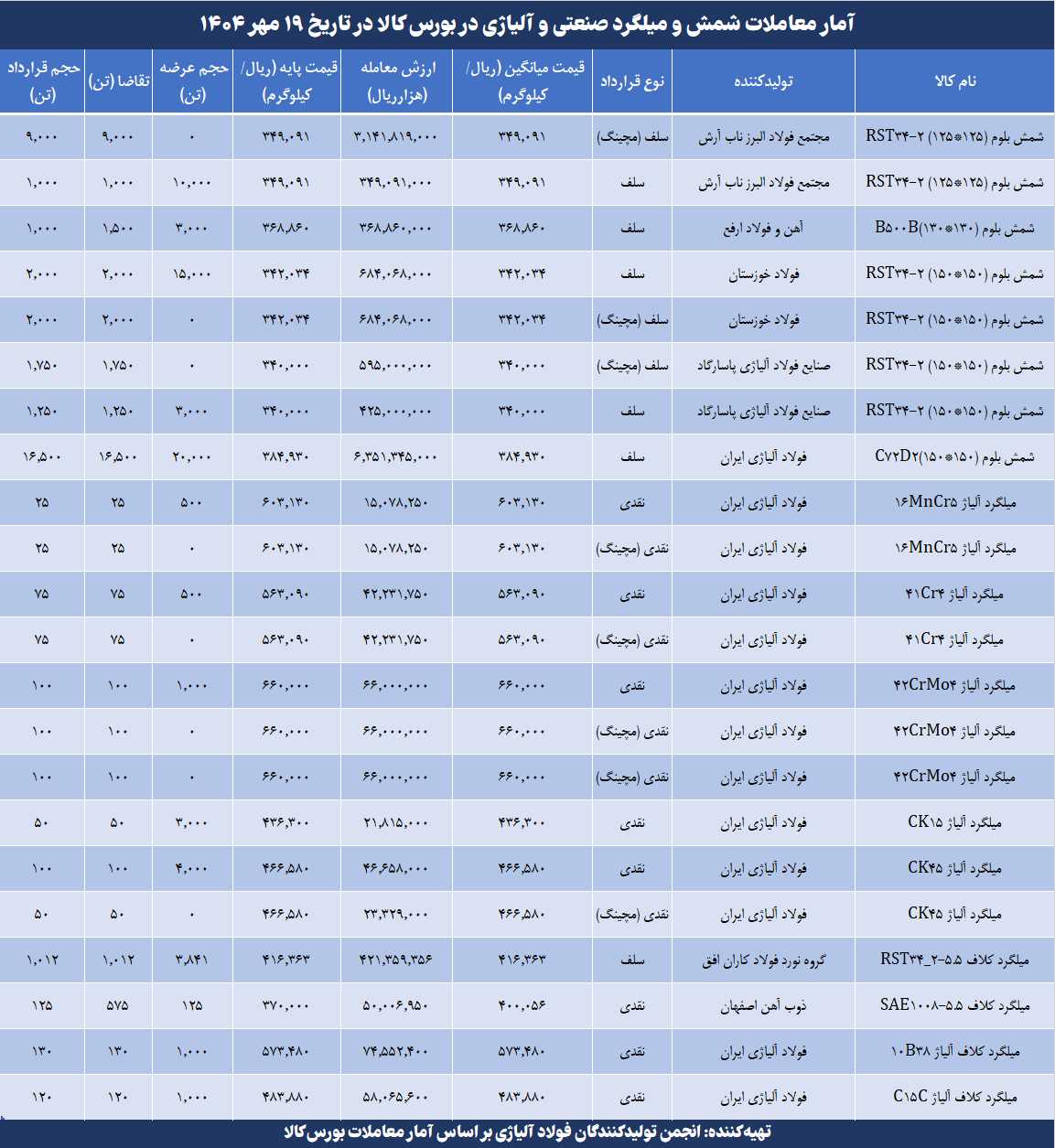 به گزارش پترومتالز به نقل از انجمن تولیدکنندگان فولاد آلیاژی، در جریان معاملات هفته جاری بورس کالا، حجم کل معاملات شمش و میلگرد صنعتی و آلیاژی به ۳۶هزار و ۵۸۷ تن رسید که بخش عمده آن به معاملات شمش بلوم اختصاص داشت. جزئیات کامل معاملات فولاد صنعتی و آلیاژی در هفته جاری شامل حجم عرضه، حجم معاملات، میزان تقاضا، قیمتها و ارزش معاملات را در جدول فوق ببینید.