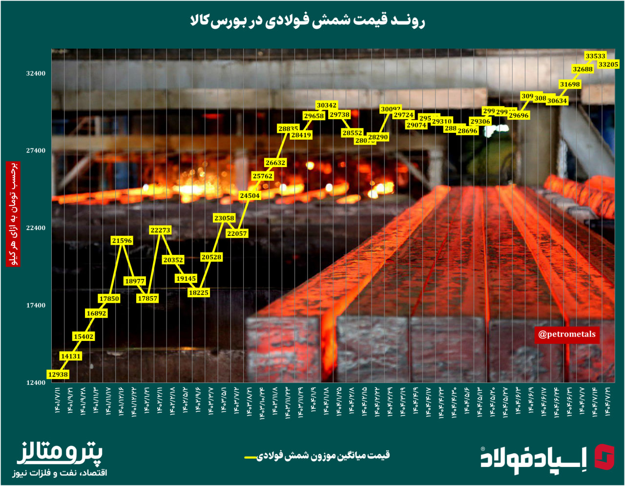 به گزارش اقتصاد، نفت و فلزات نیوز، در هفته جاری قیمت شمش فولادی در بورس کالا نسبت به هفته گذشته ۳۲۸ تومان به ازای هر کیلو معادل ۱ درصد کاهش یافت و به ۳۳۲۰۵ تومان به ازای هر کیلو بدون احتساب مالیات بر ارزش افزوده رسید. بدین ترتیب، قیمت شمش فولادی پس از سه هفته متوالی سقف‌شکنی، در هفته جاری نخستین عقب‌نشینی خود از سقف تاریخی را تجربه کرد.