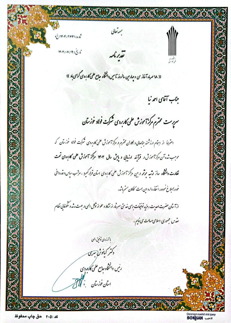 کسب رتبه برتر دانشگاه علمی کاربردی فولاد خوزستان در بین دانشگاه های علمی کاربردی استان