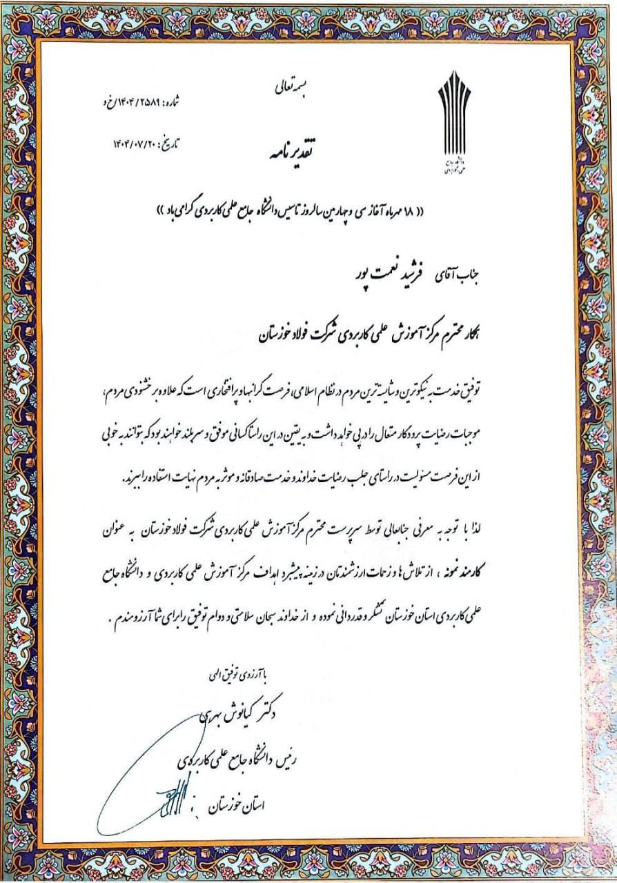 در مراسمی که روز دوشنبه ۲۱ مهرماه ۱۴۰۴ با حضور حبیب فضل الله پور معاون سیاسی استاندار خوزستان، علی‌حسین حسین‌زاده رئیس دانشگاه شهید چمران اهواز، کیانوش بهرهی رئیس دانشگاه جامع علمی‌ کاربردی استان خوزستان و اکبر حیدری رئیس سازمان بسیج اساتید استان خوزستان در دانشگاه جامع علمی و کاربردی خوزستان برگزار شد، از غلامرضا احمدنیا رئیس مرکز آموزش علمی کاربردی شرکت فولاد خوزستان به پاس کسب رتبه برتر در میان مراکز آموزش علمی کاربردی استان و فرشید نعمت‌پور کارمند واحد آموزش و توسعه منابع انسانی شرکت فولاد خوزستان به عنوان کارمند برتر در سال ۱۴۰۳ تجلیل به عمل آمد.