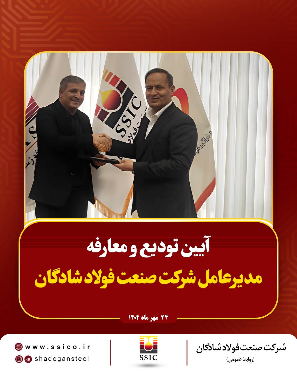 به گزارش پترومتالز، آیین تودیع و معارفه مدیرعامل شرکت صنعت فولاد شادگان روز چهارشنبه ۲۳ مهرماه ۱۴۰۴ با حضور اعضای هیئتمدیره، مدیران ارشد و جمعی از کارکنان این شرکت برگزار شد.