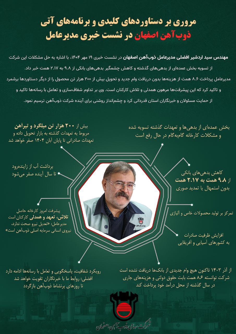 در اینفوگرافیک زیر مروری بر دستاوردهای کلیدی و برنامههای آتی ذوبآهن اصفهان در نشست خبری مدیرعامل انجام شده است.