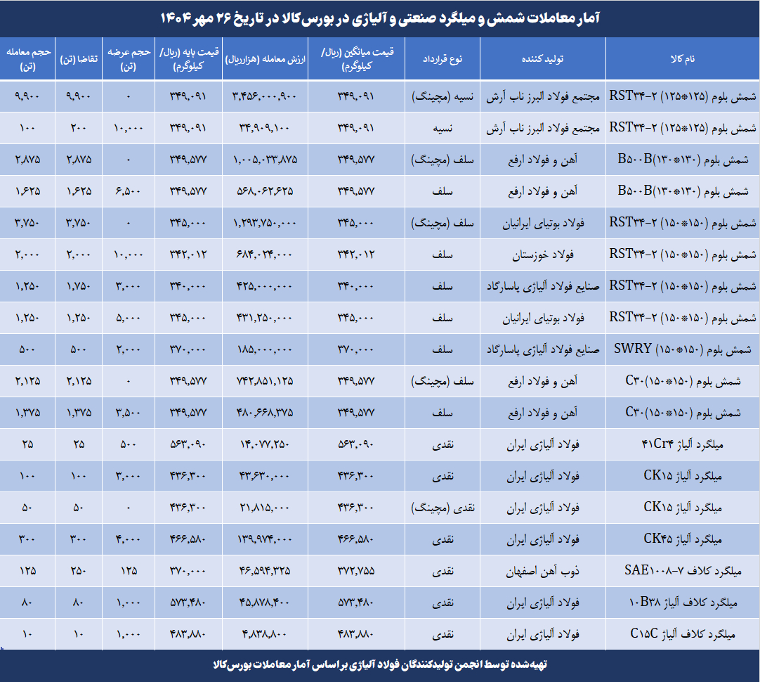 حجم کل معاملات شمش بلوم به ۲۶,۷۵۰ تن بالغ شد. در مقابل، حجم کل معاملات میلگردها، شامل انواع آلیاژی و کلاف، به ۶۹۰ تن رسید.