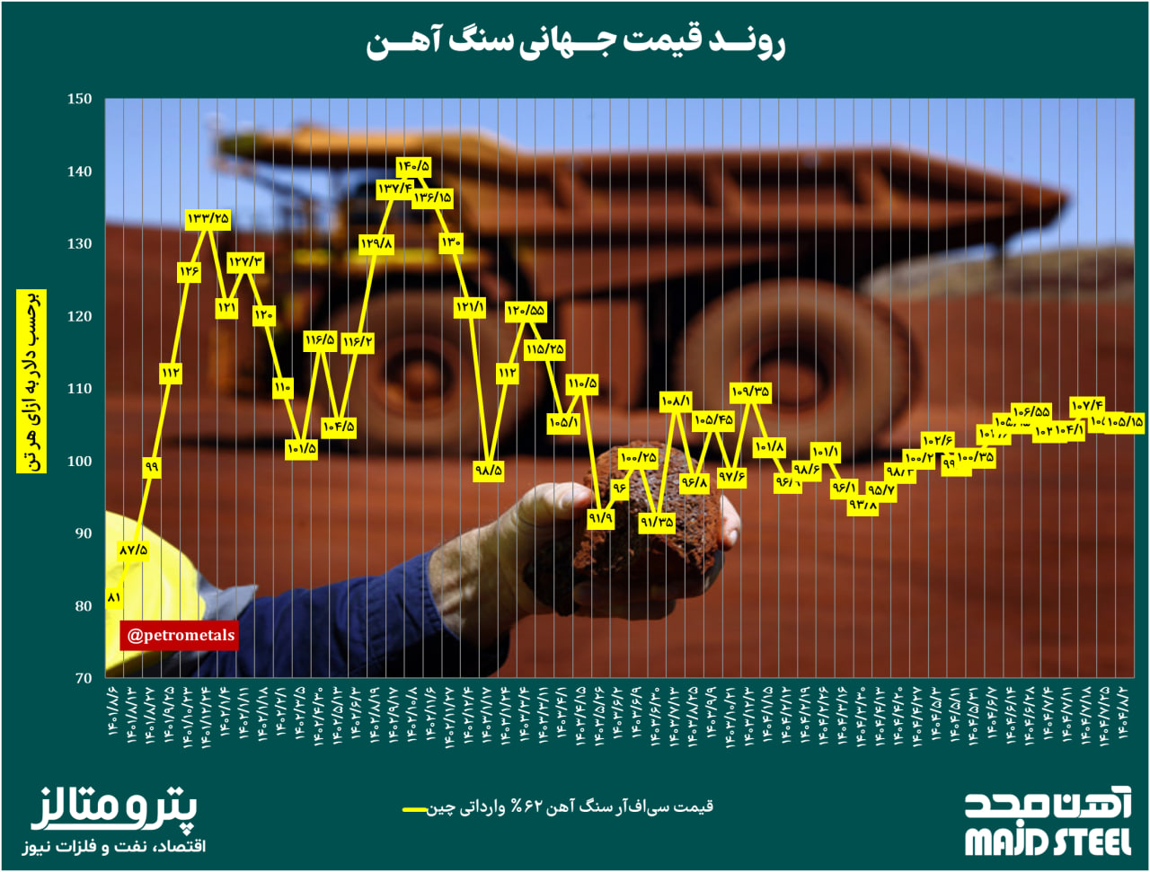 به گزارش اقتصاد، نفت و فلزات نیوز، قیمت سنگآهن عیار ۶۲ درصد وارداتی چین هفته گذشته با کاهش هفتگی جزئی ۰.۱۵ دلاری معادل ۰.۱ درصدی به ۱۰۵.۱۵ دلار به ازای هر تن رسید.