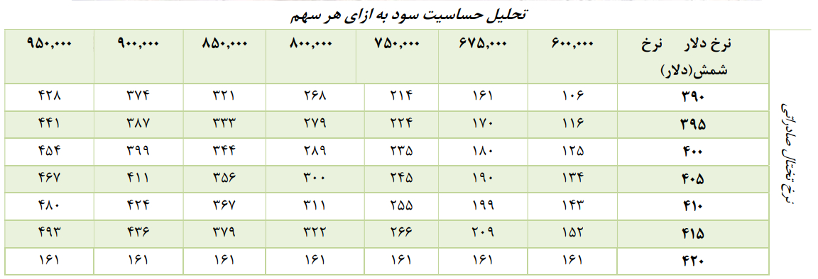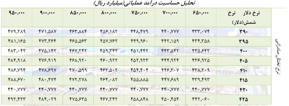 تحلیل حساسیت بر اساس نرخ‌های متنوع تختال صادراتی و دلار، نشان می‌دهد که فروش شرکت تا پایان امسال بر اساس تغییر هر یک از دو متغیر، به چه صورت خواهد بود. عدد منطقی با فرض دلار ۷۵۰۰۰ تومانی و تختال ۴۰۰ دلاری، عدد ۴۵ هزار میلیارد تومان است.