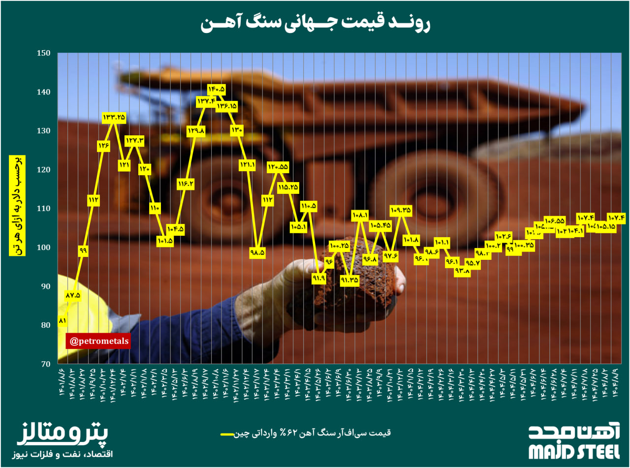 به گزارش اقتصاد، نفت و فلزات نیوز، قیمت سنگآهن عیار ۶۲ درصد وارداتی چین هفته گذشته با افزایش هفتگی ۲.۲۵ دلاری معادل ۲.۱ درصدی به ۱۰۷.۴ دلار به ازای هر تن رسید. چیزی که باعث افزایش قیمتها شد، نتیجه مثبت دیدار روسای جمهور آمریکا و چین بود که خطر تعرفه جدید ۱۰۰ درصدی را رفع کرد. با این حال، بنیادهای بازار فولاد و سنگ آهن همچنان ضعیف است.