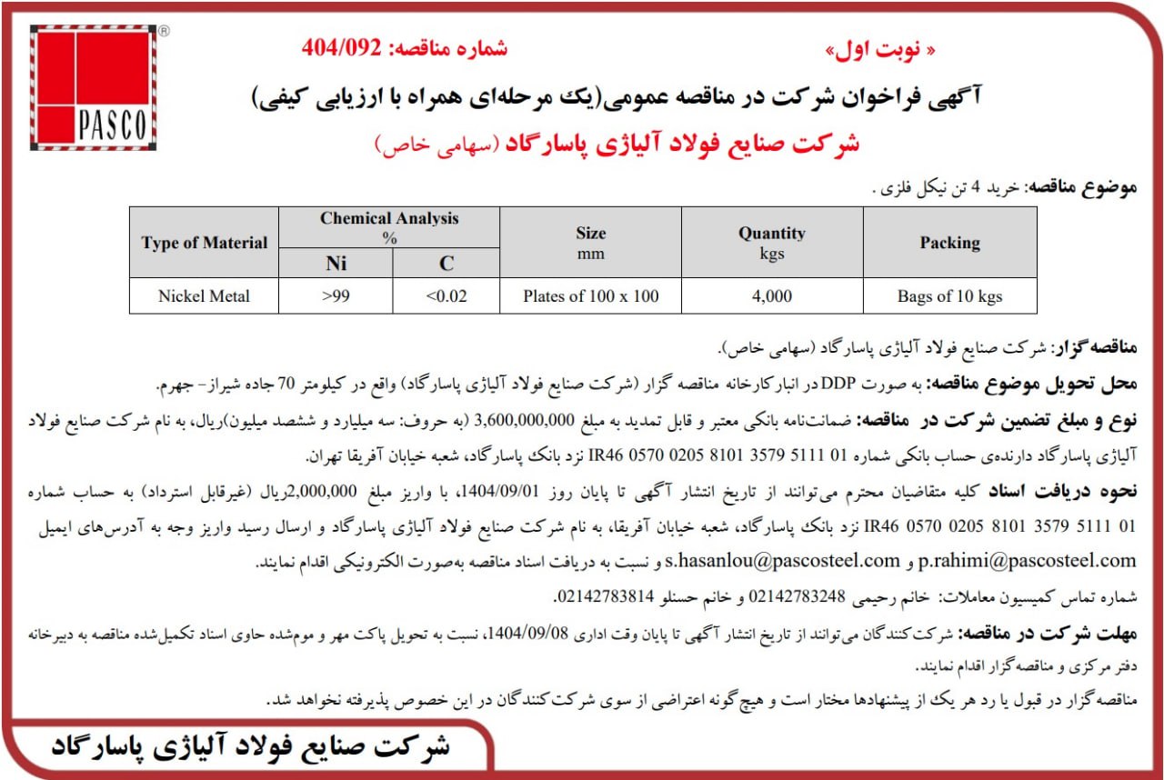 به گزارش پترومتالز، شرکت صنایع فولاد آلیاژی پاسارگاد به منظور خرید ۴ تن نیکل فلزی مناقصه عمومی یک مرحلهای همراه با ارزیابی کیفی برگزار میکند.
