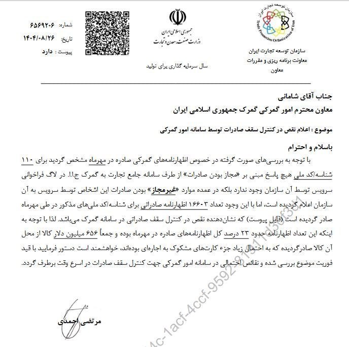 در نامه‌ای که مرتضی احمدی، معاون برنامه‌ریزی و مقررات سازمان توسعه تجارت در تاریخ ۲۶ آبان ۱۴۰۴ خطاب به «شامانی» معاون امور گمرکی کشور ارسال کرده، تأکید شده که بررسی لاگ‌های سامانه جامع تجارت نشان می‌دهد برای ۱۱۰ شناسه یا ‌کد ملی هیچ پاسخی مبنی بر «مجاز بودن صادرات» صادر نشده و حتی در «عمده موارد»، این سامانه صراحتاً عدم مجوز صادرات را اعلام کرده است.