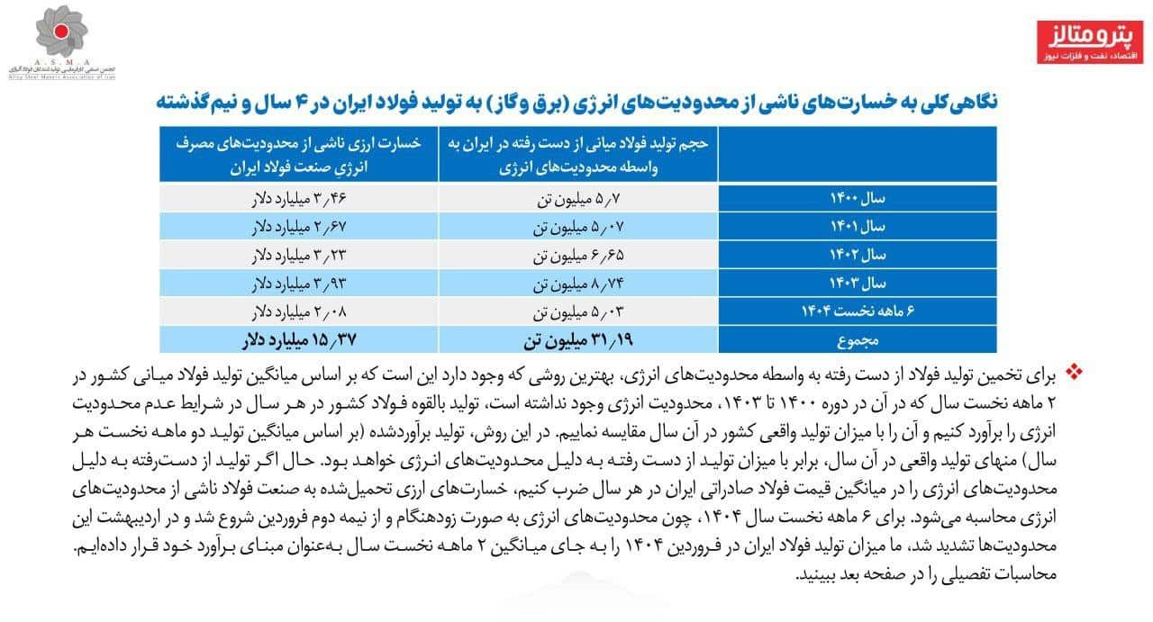 به گزارش پترومتالز، گزارش منتشرشده توسط انجمن تولیدکنندگان فولاد آلیاژی نشان می‌دهد، در ۴ سال و نیم اخیر (از ابتدای سال ۱۴۰۰ تا انتهای شهریور ۱۴۰۴)، مجموعاً ۳۱.۲ میلیون تن تولید فولاد کشور به ارزش حدوداً ۱۵.۴ میلیارد دلار صرفاً به واسطه محدودیت‌های مصرف برق و گاز از دست رفته است! جزئیات بیشتر را در تصویر فوق ببینید.