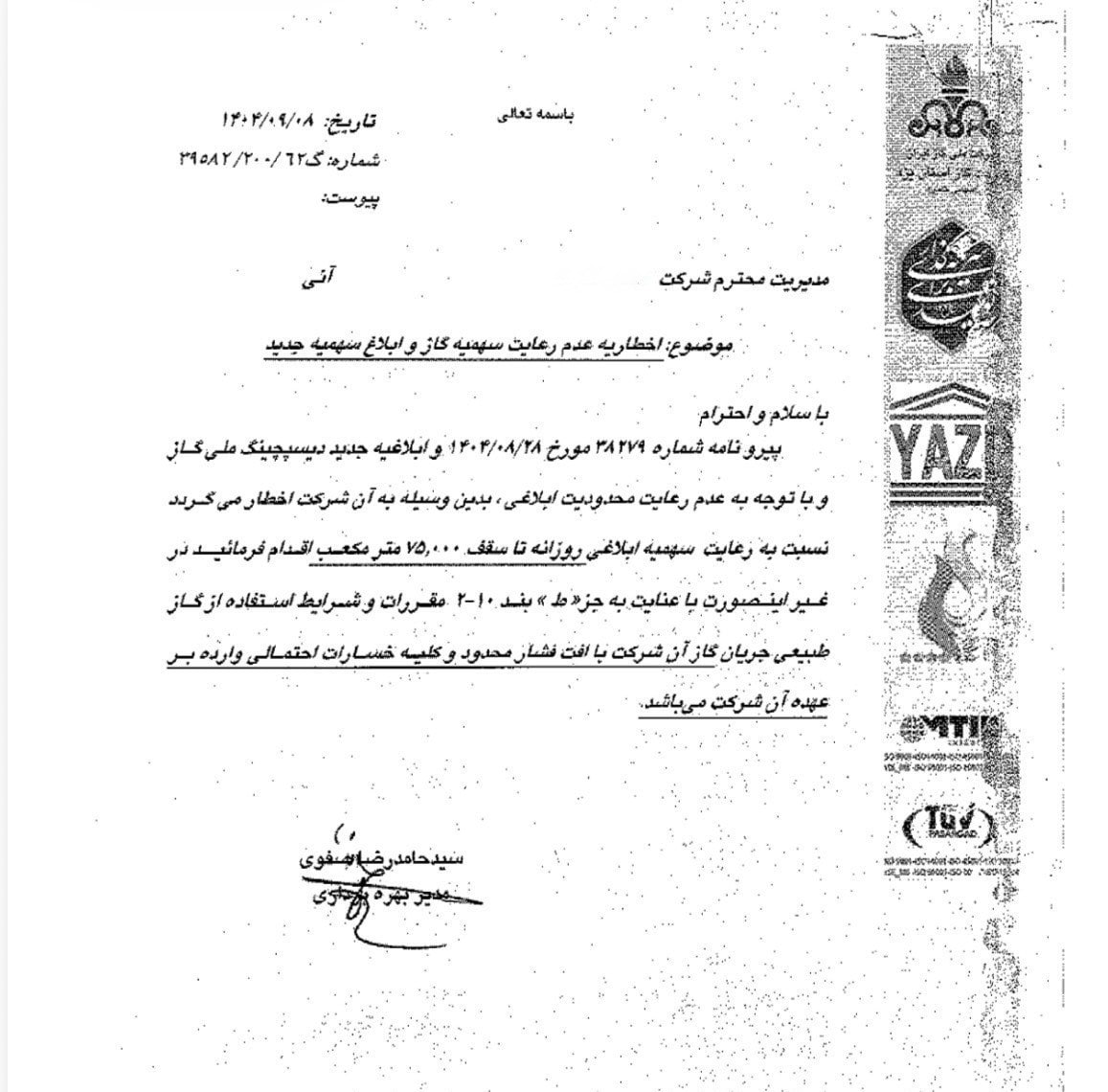 وضعیت مشابهی در صنعت فولاد نیز مشاهده می‌شود. وزارت صمت اعلام کرده فولادی‌های صادرات‌محور قطعی گاز ندارند، اما اسناد رسمی دیسپچینگ ملی گاز نشان می‌دهد محدودیت‌ها همچنان برقرار است. نمونه بارز آن، اخطاریه‌ای است که اخیراً به یک تولیدکننده فولاد ارسال شده و در آن آمده است که در صورت عدم رعایت سهمیه روزانه ۷۵،۰۰۰ مترمکعب، جریان گاز با افت فشار محدود خواهد شد و کلیه خسارات احتمالی بر عهده شرکت خواهد بود.