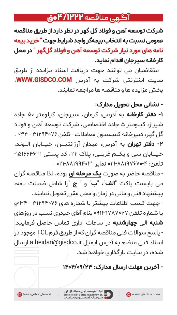 مناقصه توسعه آهن و فولاد گل گهر برای خرید بیمه نامه‌های مورد نیاز شرکت