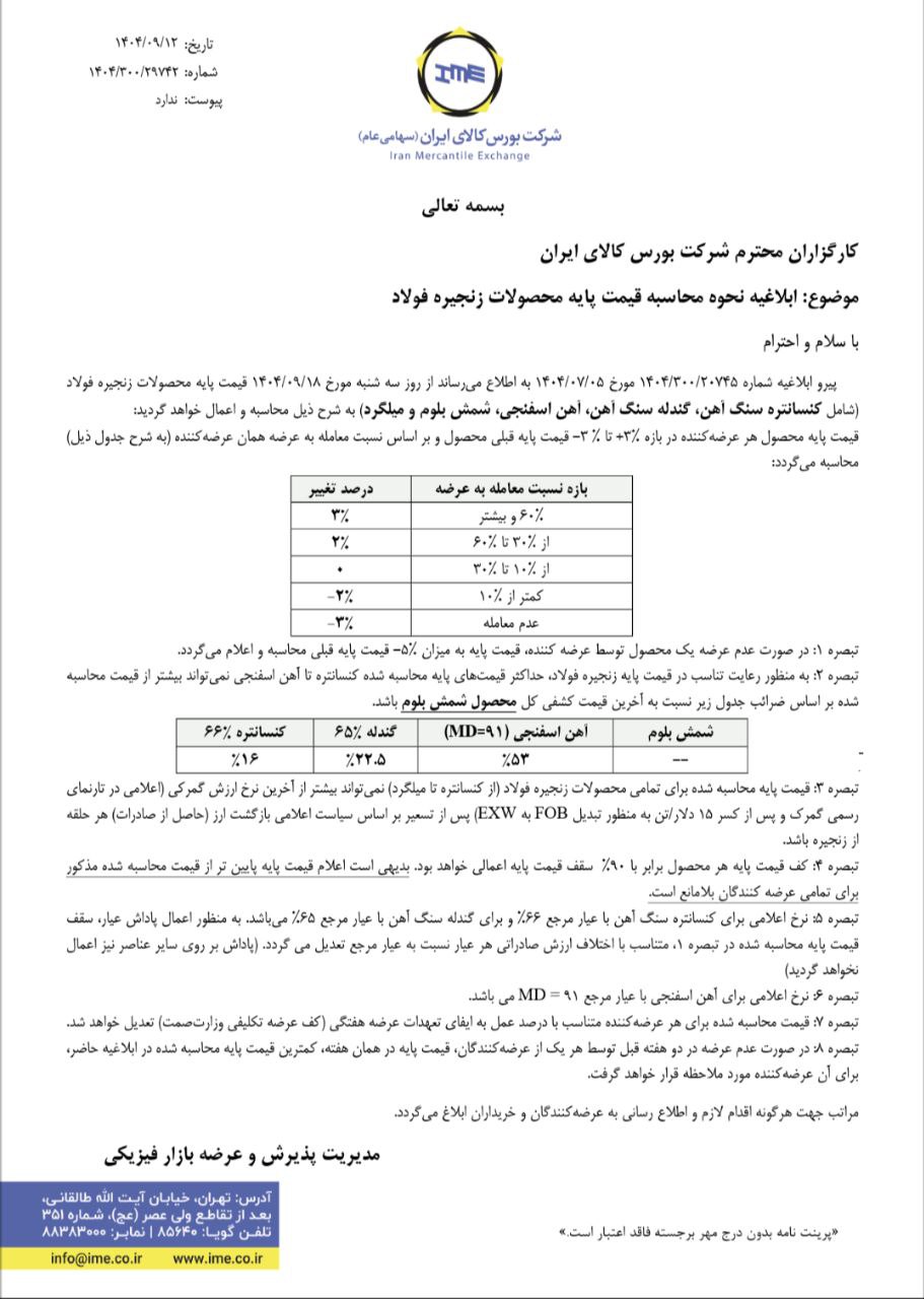 به گزارش پترومتالز، بورس کالای ایران در ابلاغیه‌ای رسمی، فرمول تازه محاسبه قیمت پایه محصولات زنجیره فولاد— کنسانتره، گندله، آهن اسفنجی، شمش بلوم و میلگرد—را از ۱۸ آذر ۱۴۰۴ لازم‌الاجرا اعلام کرد. متن کامل ابلاغیه را در فوق ببینید.
