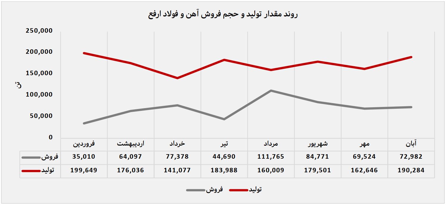 در آبان ماه، استراتژی فروش ارفع بهطور کامل بر شمش فولادی متمرکز بود و فروش آهن اسفنجی بهصورت موقت متوقف شد. تمام درآمد ثبتشده نیز از محل فروش شمش در بازار داخلی بهدستآمده و این محصول با میانگین نرخ ۳۵ میلیون تومان به ازای هر تن معاملهشده است. این تمرکز هدفمند بر فروش شمش در شرایط کنونی بازار سبب شده تا شرکت بتواند از نوسانات قیمتی عبور و جریان نقدی پایدار ایجاد کند.