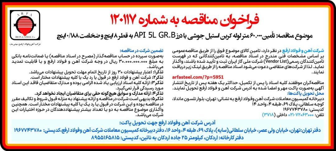 مناقصه گران موظفند کلیه اسناد را پس از تکمیل حداکثر یک هفته پس از تاریخ انتشار آگهی به صورت پاکت مهر و امضا شده به آدرس شرکت آهن و فولاد ارفع تحویل نمایند.