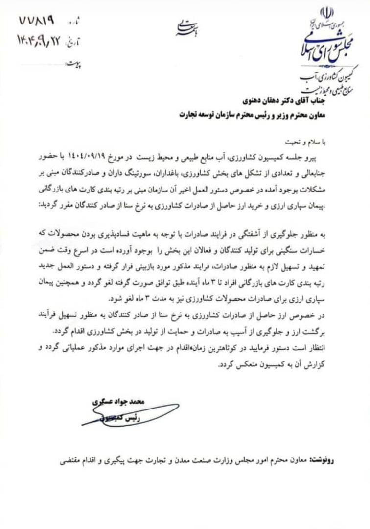 به گزارش پترومتالز، رئیس کمیسیون کشاورزی مجلس شورای اسلامی در نامهای خطاب به رئیس سازمان توسعه تجارت، خواستار توقف سه ماههی دستورالعملهای رتبهبندی کارتهای بازرگانی شد. علت این درخواست، جلوگیری از فساد محصولات کشاورزی و زیان تولیدکنندگان محصولات کشاورزی عنوان شده است.