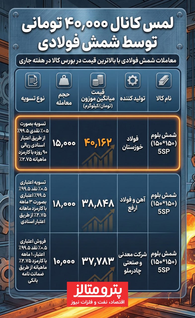 به گزارش پترومتالز، در معاملات هفته جاری بورس کالا، قیمت شمش فولادی برای نخستین بار کانال ۴۰ هزار تومانی را لمس کرد.