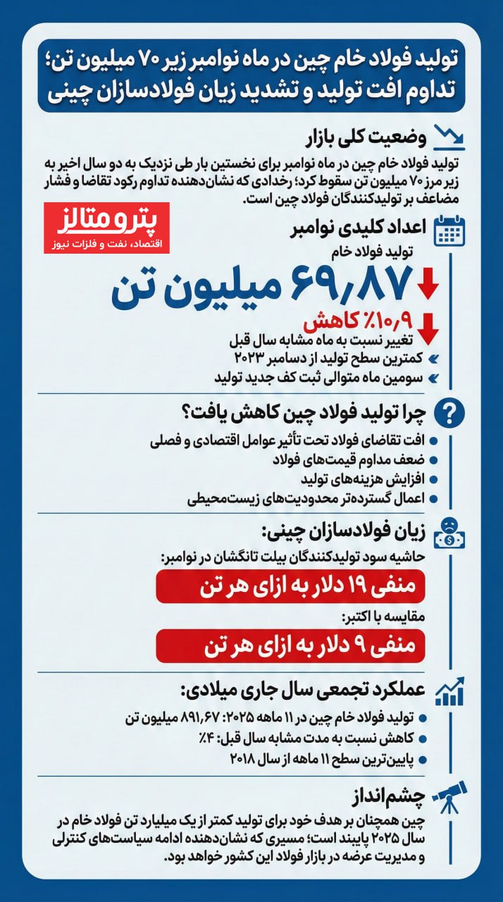 آمارهای تجمعی نشان میدهد تولید فولاد خام چین در ۱۱ ماهه سال جاری با افت ۴ درصدی به ۸۹۱٫۶۷ میلیون تن رسیده که پایینترین سطح از سال ۲۰۱۸ تاکنون است؛ روندی که با هدفگذاری تولید کمتر از یک میلیارد تن فولاد خام در سال ۲۰۲۵ همخوانی دارد.