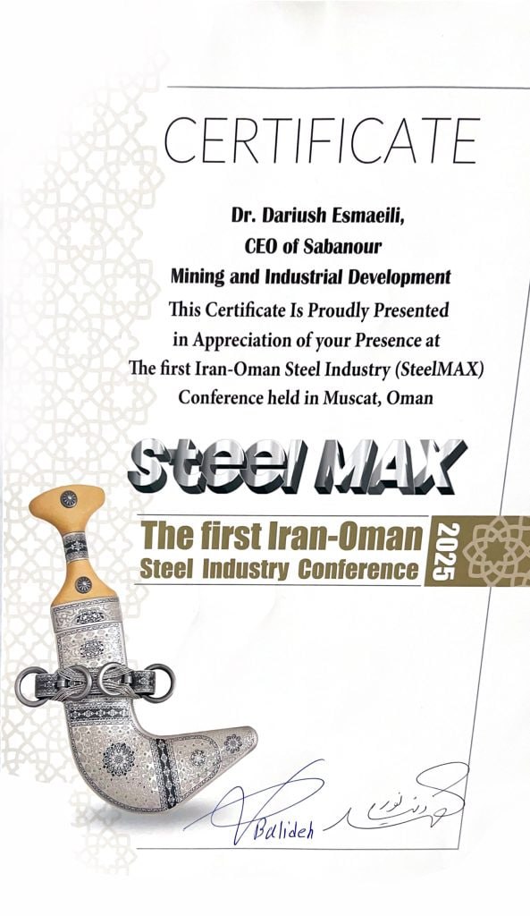 به گزارش پترومتالز، در جریان نخستین کنفرانس صنعت فولاد ایران–عمان SteelMAX در مسقط، از شرکت توسعه معدنی و صنعتی صبانور به‌دلیل حضور مؤثر و مشارکت فعال در این رویداد بین‌المللی تقدیر شد و گواهی قدردانی کنفرانس به دکتر داریوش اسماعیلی، مدیرعامل صبانور اهدا گردید.