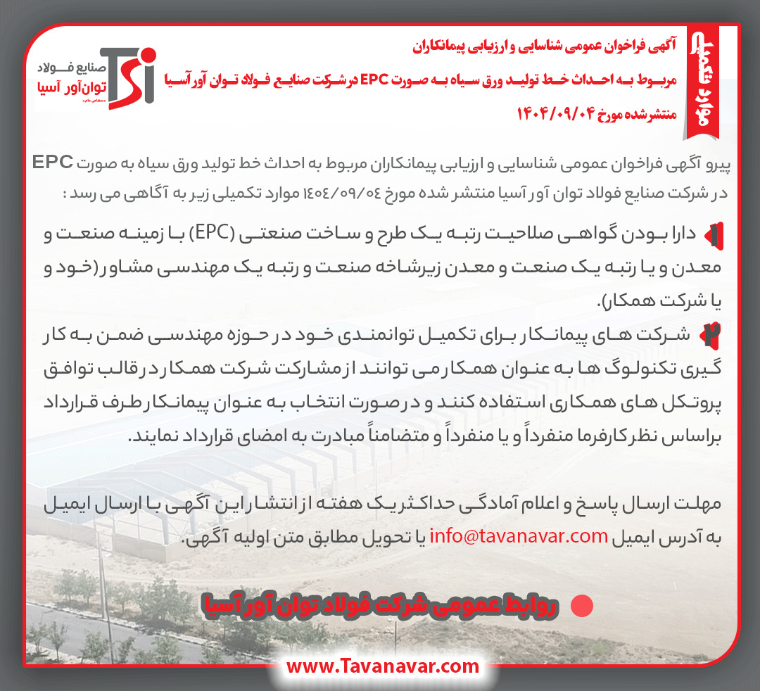به گزارش پترومتالز، پیرو آگهی فراخوان عمومی شناسایی و ارزیابی پیمانکاران مربوط به احداث خط تولید ورق سیاه به صورت EPC در شرکت صنایع فولاد توان آور آسیا منتشر شده مورخ ١٤٠٤/٠٩/٠٤ موارد تکمیلی زیر به آگاهی می رسد: