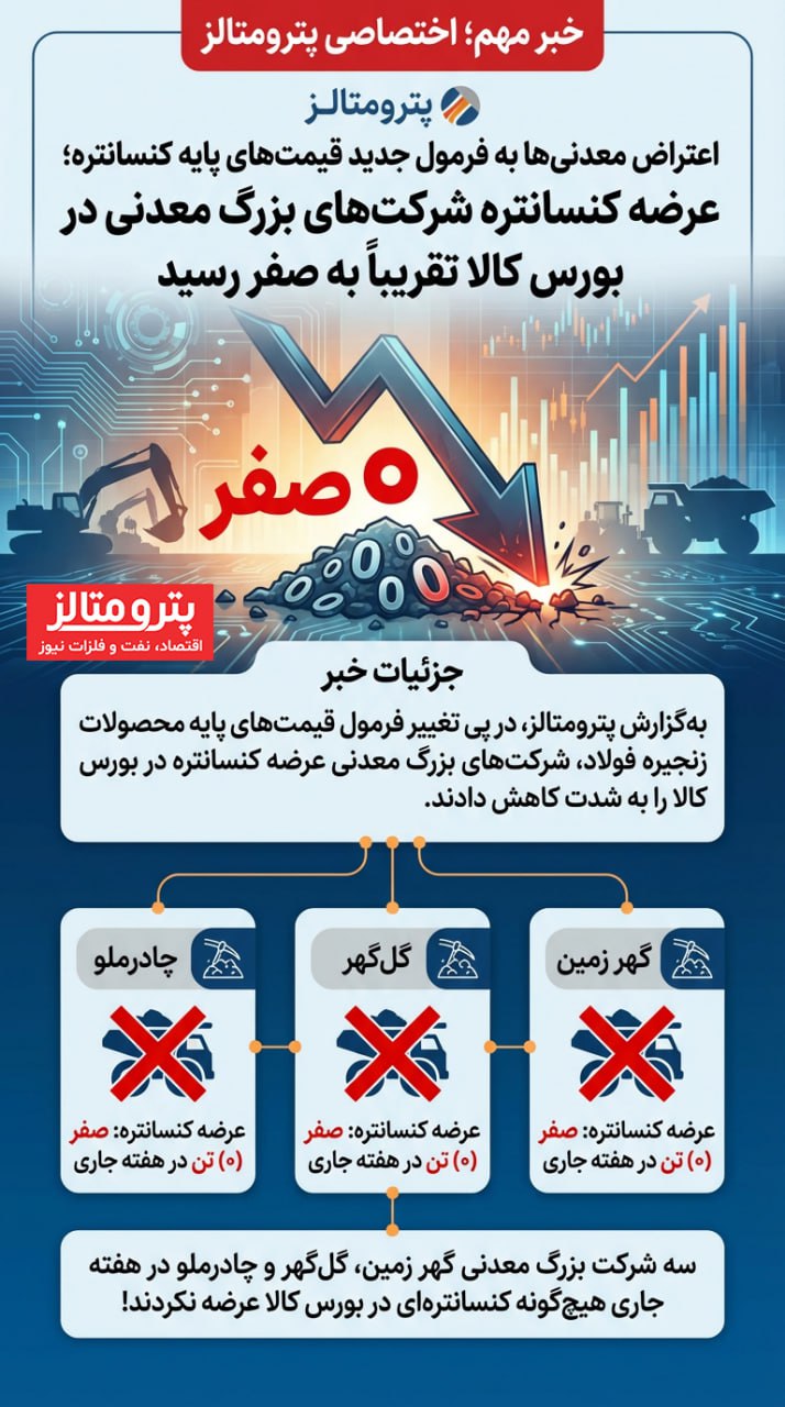 شنیده‌های پترومتالز از منابع موثق حاکی از آن است که شرکت‌های معدنی نسبت به فرمول جدید قیمت پایه کنسانتره اعتراض جدی دارند و در واکنش به این تغییر، عرضه کنسانتره را به حداقل رسانده‌اند؛ به‌گونه‌ای که عرضه این محصول از سوی شرکت‌های بزرگ معدنی عملاً در هفته جاری به صفر رسید.