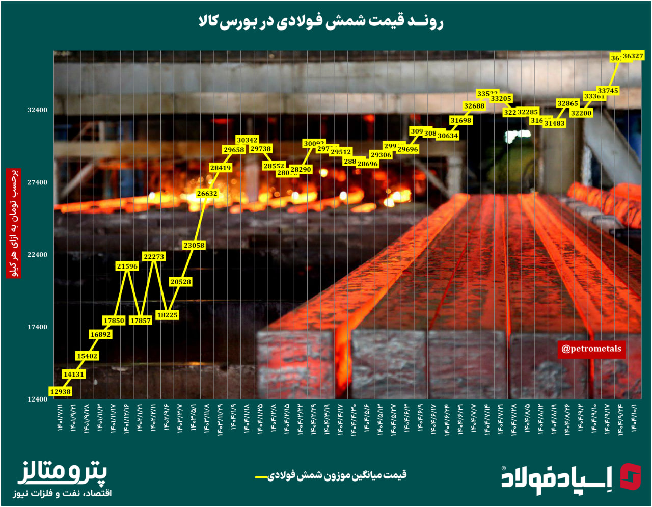 به گزارش اقتصاد، نفت و فلزات نیوز، در هفته جاری قیمت میانگین شمش فولادی در بورس کالا نسبت به هفته گذشته ۱۵۳ تومان به ازای هر کیلو معادل ۰.۴ درصد افزایش یافت و به ۳۶۳۲۷ تومان به ازای هر کیلو بدون احتساب مالیات بر ارزش افزوده رسید که بالاترین قیمت شمش فولادی در تاریخ معاملات آن در بورس کالا است. قیمت شمش فولادی در حال حاضر بیش از ۲۹.۴ درصد بالاتر از کف قیمت آن در (۱۵ اردیبهشت) سال جاری است.