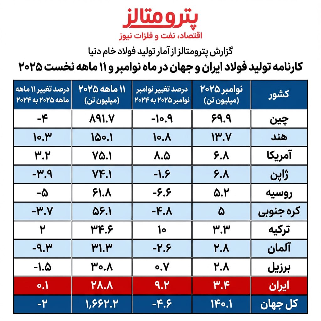 در مجموع ۱۱ ماهه نخست سال ۲۰۲۵، تولید فولاد ایران با یک دهم درصد رشد نسبت به دوره مشابه سال گذشته به ۲۸.۸ میلیون تن رسید، در حالی که مجموع تولید جهانی در این مدت با کاهشی ۲ درصدی همراه بوده و رقم ۱ میلیارد و ۶۶۲.۲ میلیون تن را ثبت کرده است.