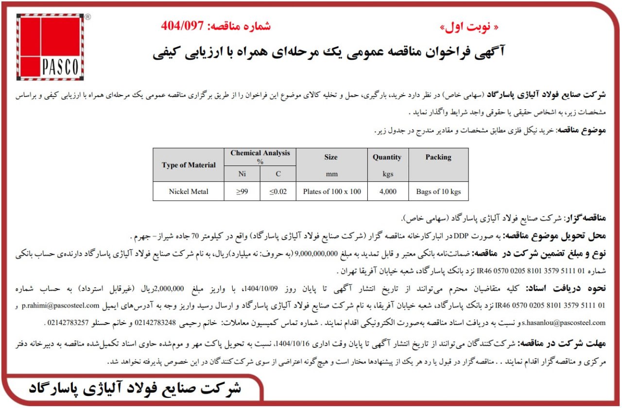 مناقصه عمومی شرکت صنایع فولاد آلیاژی پاسارگاد به منظور خرید نیکل