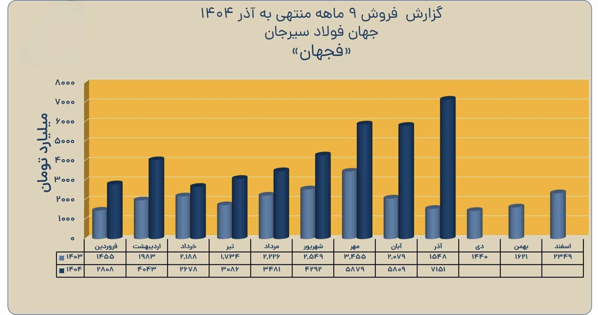 درآمد جهان فولاد سیرجان در آذر ماه امسال نیز عملکردی درخشان را رقم زده است. شرکت در آذر 1403 حدود 1548 میلیارد تومان درآمد ثبت کرده بود که با رشدی 4 برابری در آذر 1404 به 7151 میلیارد تومان رسیده است. هم چنین نسبت به آبان 1404 افزایش 23 درصدی را به ثبت رساند و پاییز خود را با رشد درآمد سپری کرد.