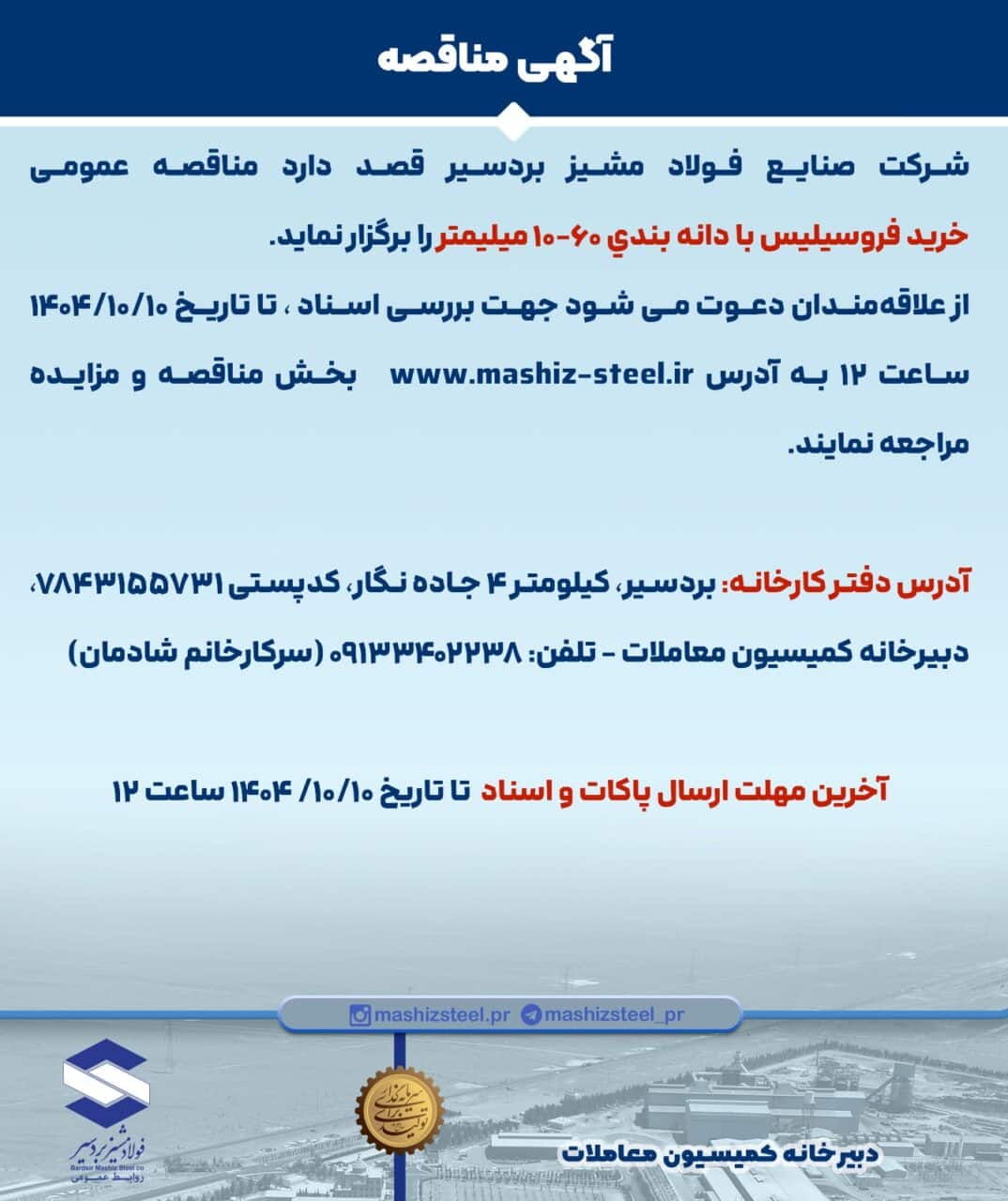 این شرکت از کلیه شرکت‌های تأمین‌کننده دارای صلاحیت دعوت به عمل آورد در صورت تمایل، از تاریخ 22/10/1404 لغایت 29/10/1404 درخواست دریافت اسناد مناقصه را طی نامه رسمی به نشانی پست الکترونیکی SRM@sisco.midhco.com ارسال نموده و یا برای دریافت اسناد مناقصه به صورت حضوری به ستاد کرمان این شرکت به آدرس کرمان خیابان هزارو یکشب 17 انتهای کوچه سمت راست مراجعه نمایند.