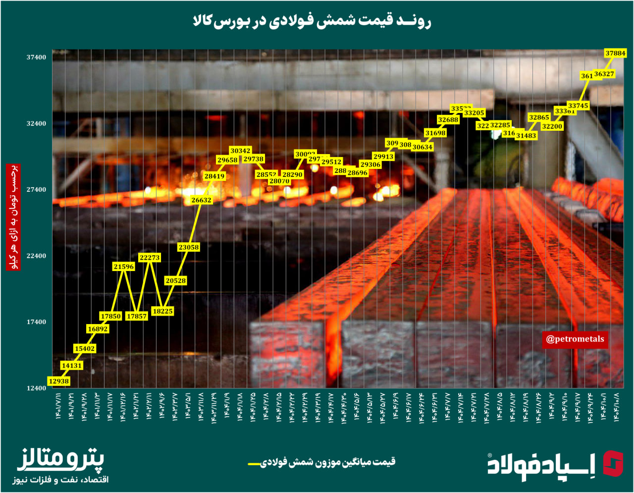 به گزارش اقتصاد، نفت و فلزات نیوز، در هفته جاری قیمت میانگین شمش فولادی در بورس کالا نسبت به هفته گذشته ۱۵۵۷ تومان به ازای هر کیلو معادل ۴.۳ درصد افزایش یافت و به ۳۷۸۸۴ تومان به ازای هر کیلو بدون احتساب مالیات بر ارزش افزوده رسید که بالاترین قیمت شمش فولادی در تاریخ معاملات آن در بورس کالا است. قیمت شمش فولادی در بورس کالا در این هفته برای پنجمین هفته متوالی افزایش یافت.