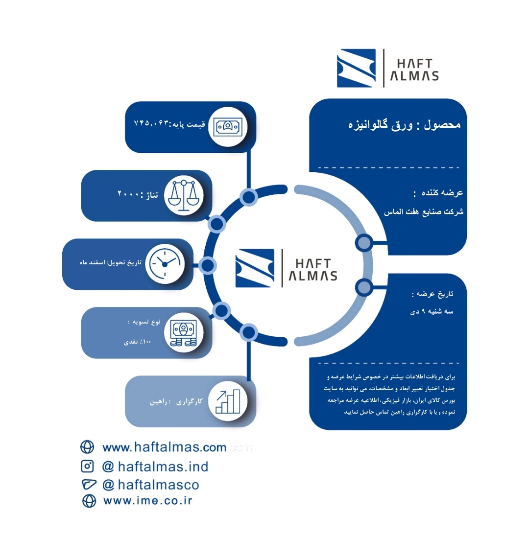 به گزارش پترومتالز، سهشنبه ۹ دی ماه ۲ هزار تن ورق گالوانیزه شرکت صنایع هفت الماس در بورس کالا عرضه می شود.