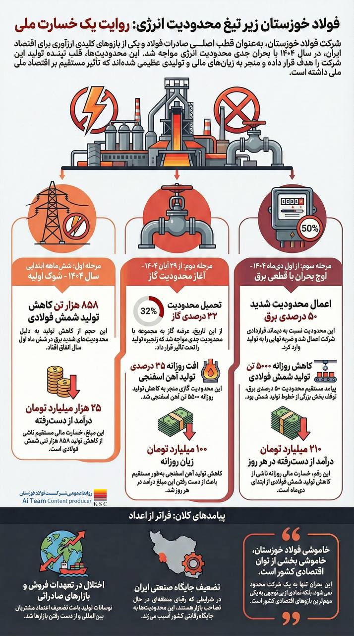 به گزارش پترومتالز، شرکت فولاد خوزستان به عنوان قطب اصلی صادرات فولاد و یکی از بازوهای کلیدی ارزآوری برای اقتصاد ایران در سال ۱۴۰۴ با بحران جدی محدودیت انرژی مواجه شد. این محدودیتها قلب تپنده تولید این شرکت را هدف قرار داده و منجر به زیانهای مالی و تولیدی عظیمی شده اند که تأثیر مستقیم بر اقتصاد ملی داشته است.