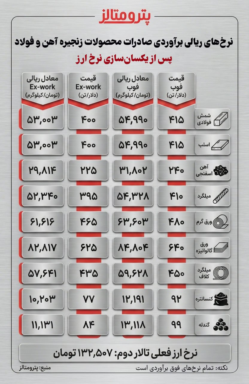 به گزارش پترومتالز، پس از یکسانسازی نرخ ارز و انتقال تمام مبادلات ارزی کشور به تالار دوم مرکز مبادله ارز و طلا، صادرات محصولات زنجیره آهن و فولاد ایران با کدام نرخهای ریالی انجام میشود؟ این سوالی است که پاسخ به آن اهمیت بسیار زیادی دارد و پترومتالز بر اساس آخرین نرخهای دلاری صادرات محصولات زنجیره آهن و فولاد در اینفوگرافیک فوق به این سوال پاسخ داده است.