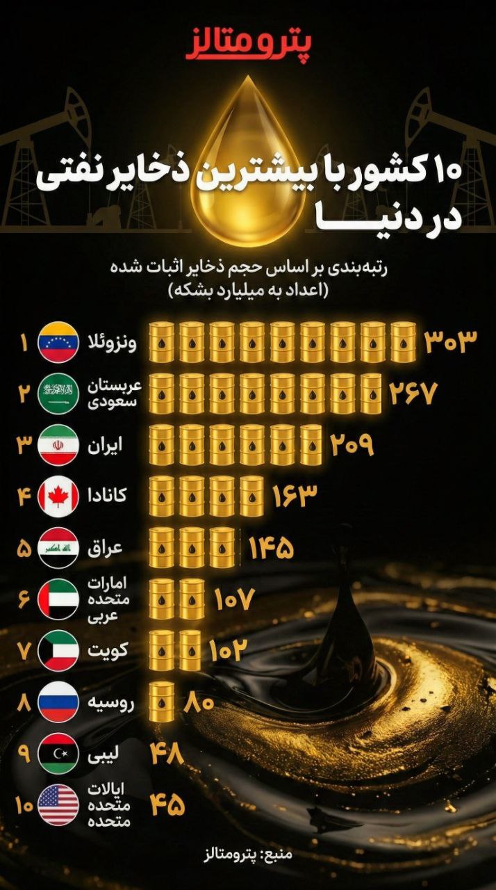 به گزارش پترومتالز، اینفوگرافیک زیر ۱۰ کشور با بیشترین ذخایر نفتی در دنیا را به تصویر کشیده است.