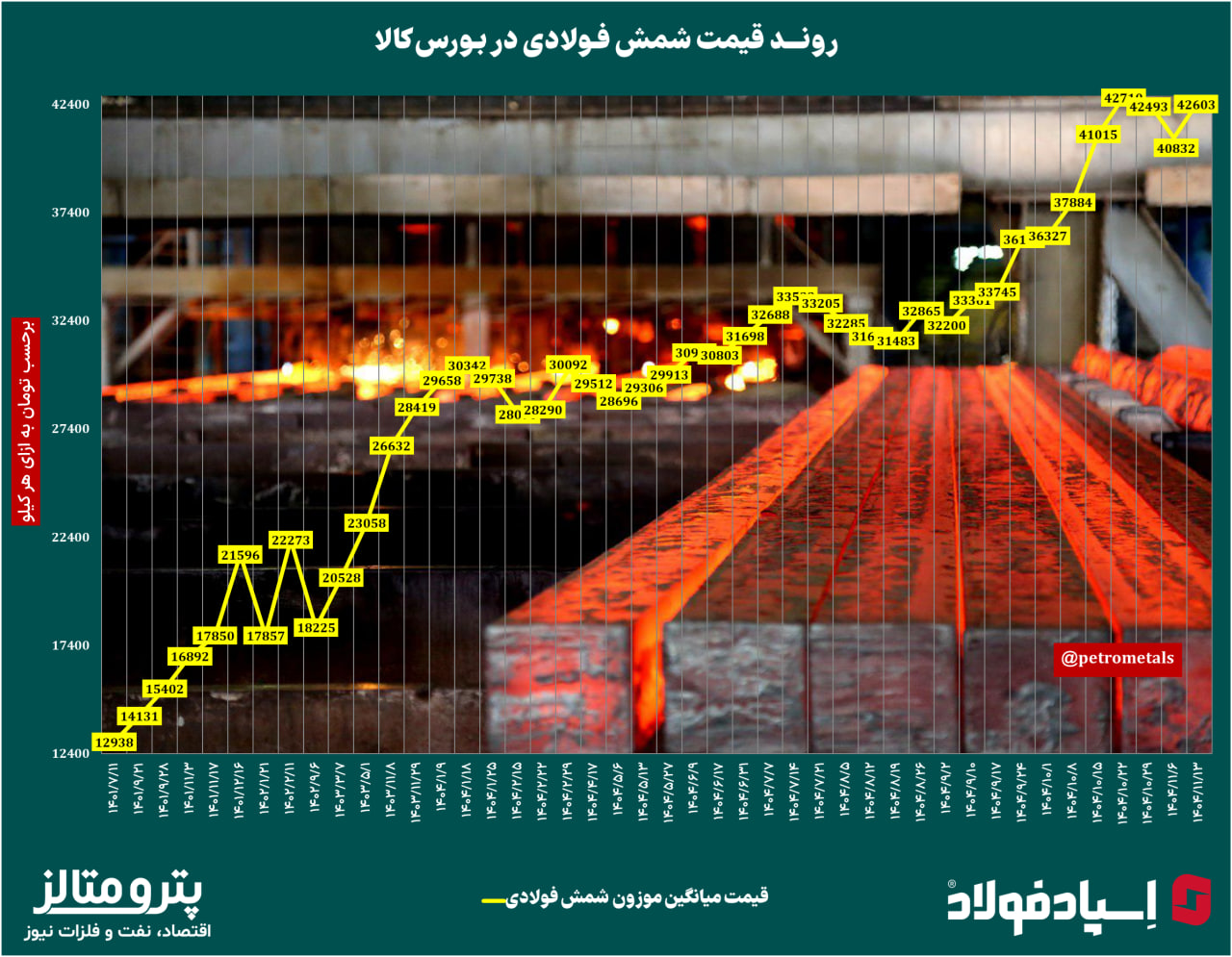 به گزارش اقتصاد، نفت و فلزات نیوز، در هفته جاری قیمت میانگین شمش فولادی در بورس کالا نسبت به هفته گذشته ۱۷۷۱ تومان به ازای هر کیلو معادل ۴.۳ درصد افزایش یافت و به ۴۲۶۰۳ تومان به ازای هر کیلو بدون احتساب مالیات بر ارزش افزوده رسید.