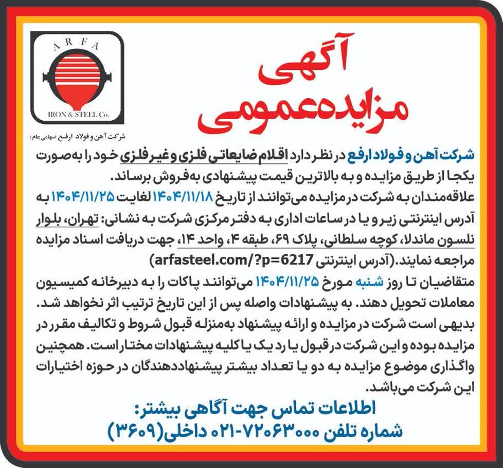 به گزارش پترومتالز، شرکت آهن و فولاد ارفع در نظر دارد اقلام ضایعاتی فلزی و غیر فلزی خود را به صورت یکجا از طریق مزایده و به بالاترین قیمت پیشنهادی به فروش برساند.