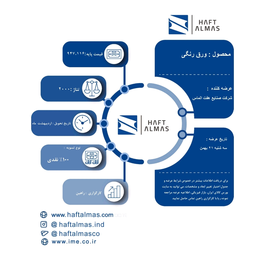 به گزارش پترومتالز، سهشنبه ۲۱ بهمن ماه ۲ هزار تن ورق رنگی، ۲ هزار تن ورق سرد و یک هزار و ۵۰۰ تن ورق گالوانیزه شرکت صنایع هفت الماس در بورس کالا عرضه می شود.