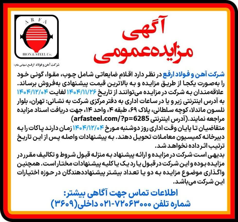 به گزارش پترومتالز، شرکت آهن و فولاد ارفع در نظر دارد اقلام ضایعاتی شامل چوب، مقوا، گونی خود را به صورت یکجا از طریق مزایده و به بالاترین قیمت پیشنهادی به فروش برساند.