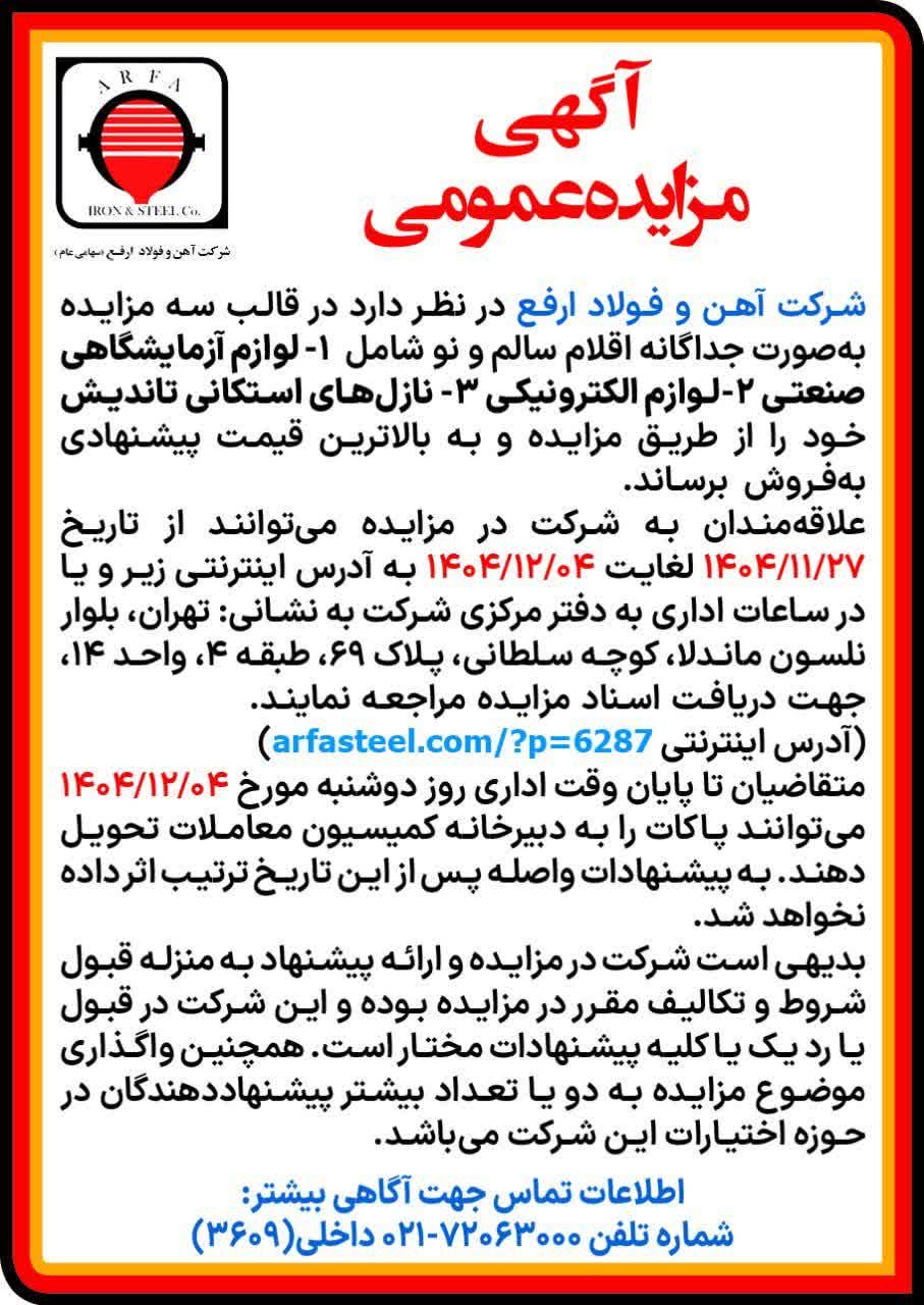 به گزارش پترومتالز، شرکت آهن و فولاد ارفع در نظر دارد در قالب سه مزایده به صورت جداگانه اقلام سالم و نو شامل لوازم آزمایشگاهی صنعتی، لوازم الکترونیکی و نازلهای استکانی تاندیش خود را از طریق مزایده و به بالاترین قیمت پیشنهادی به فروش برساند.