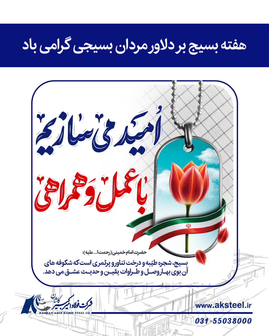 به گزارش پترومتالز، روابط عمومی شرکت فولاد امیرکبیر کاشان، هفته پرافتخار بسیج و روز بسیج مستضعفان را به تمامی دلاوران میدان ایثار و تمامی همکاران بسیجی خود در این شرکت تبریک گفت. متن پیام به شرح زیر است: بسیج، تجلیبخش روحیه جهادی، خودباوری و ایثار است. فرهنگ بسیجی، برای