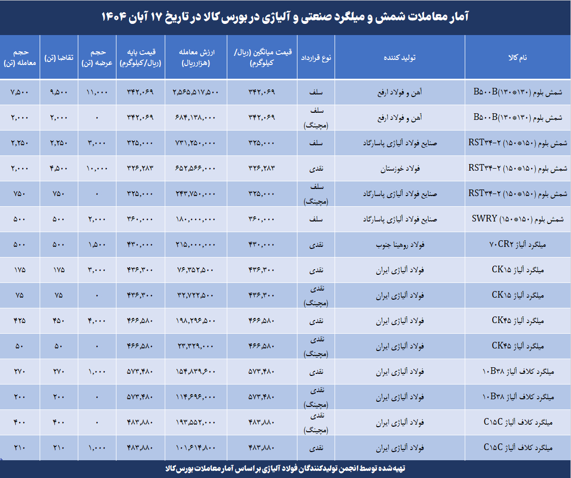 به گزارش اقتصاد، نفت و فلزات نیوز، در هفته جاری قیمت شمش فولادی در بورس کالا نسبت به هفته گذشته ۲۰۲ تومان به ازای هر کیلو معادل ۰.۶ درصد کاهش یافت و به ۳۱۴۸۳ تومان به ازای هر کیلو بدون احتساب مالیات بر ارزش افزوده رسید. حجم کل معاملات شمش