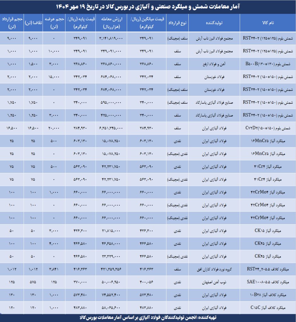 به گزارش پترومتالز به نقل از انجمن تولیدکنندگان فولاد آلیاژی، در جریان معاملات هفته جاری بورس کالا، حجم کل معاملات شمش و میلگرد صنعتی و آلیاژی به ۳۶هزار و ۵۸۷ تن رسید که بخش عمده آن به معاملات شمش بلوم اختصاص داشت. جزئیات کامل معاملات فولاد صنعتی و آلیاژی در هفته جاری شامل حجم عرضه، […]