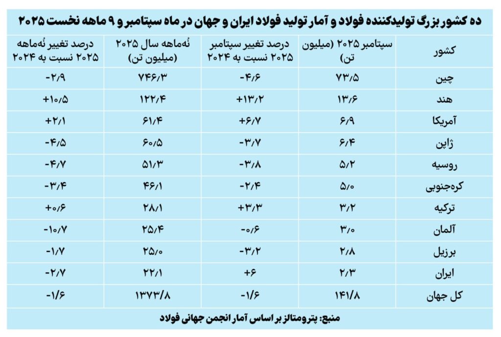 به گزارش پترومتالز، بر پایه تازهترین گزارش انجمن جهانی فولاد، تولید فولاد خام ایران در نُهماهه نخست سال ۲۰۲۵ به ۲۲٫۱ میلیون تن رسید که نسبت به مدت مشابه سال گذشته ۲٫۷ درصد کاهش نشان میدهد. با این حال، ایران همچنان با ثبت ۲٫۳ میلیون تن تولید در ماه سپتامبر و رشد ۶ درصدی نسبت […]
