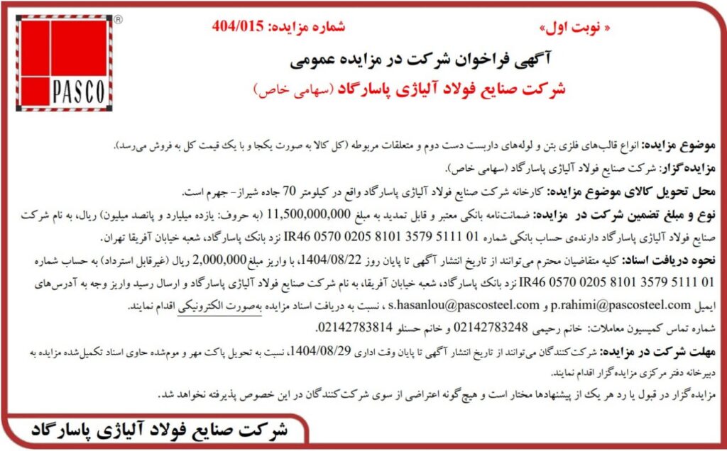 شرکت صنایع فولاد آلیاژی پاسارگاد به منظور فروش انواع قالبهای فلزی بتن و لولههای داربست دست دوم و متعلقات مربوطه (کل کالا به صورت یکجا و با یک قیمت کل) فراخوان مزایده عمومی منتشر کرد. محل تحویل کالای موضوع مزایده کارخانه شرکت صنایع فولاد آلیاژی پاسارگاد واقع در کیلومتر 70 جاده شیراز – جهرم است. […]